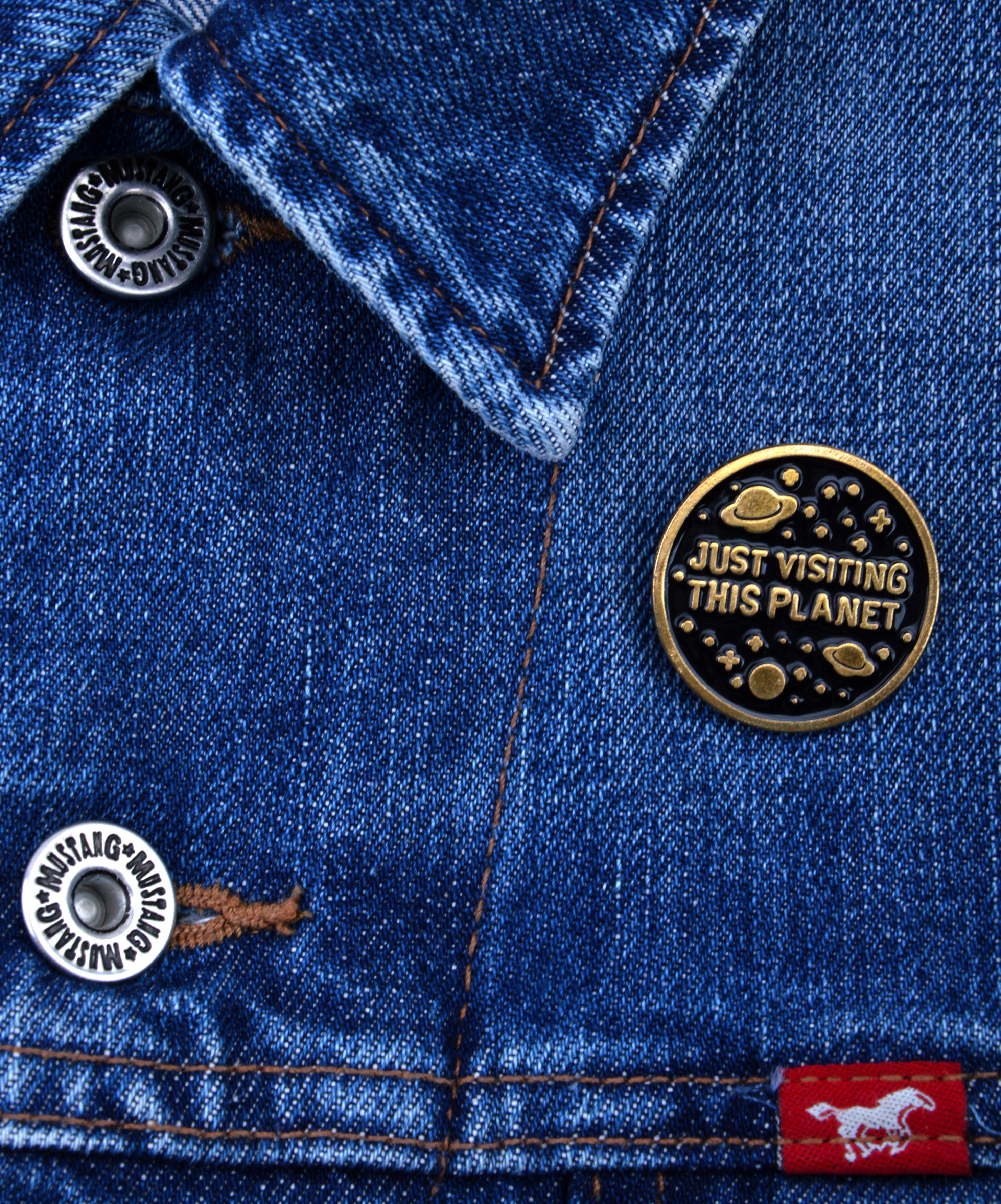 Embrace your individuality with the "Just Visiting This Planet" pin, a whimsical accessory that adds flair to any outfit. Its unique design invites curiosity and compliments from everyone around you.