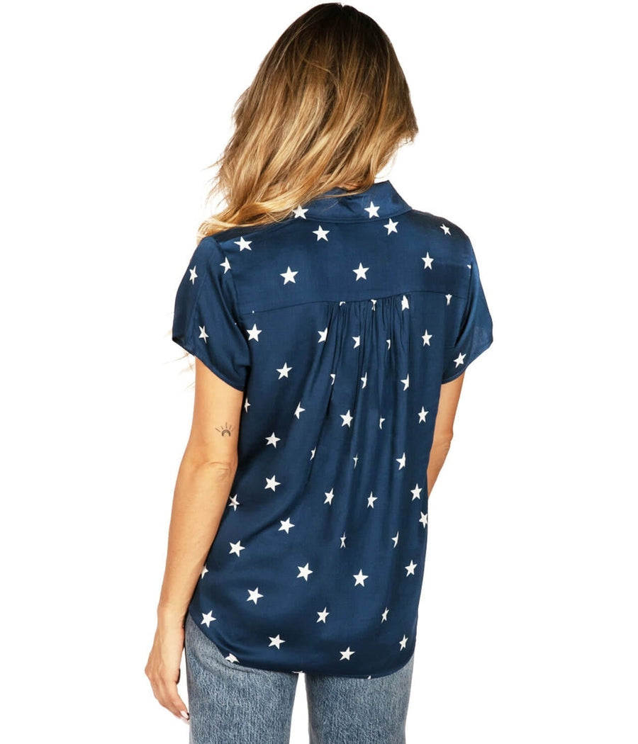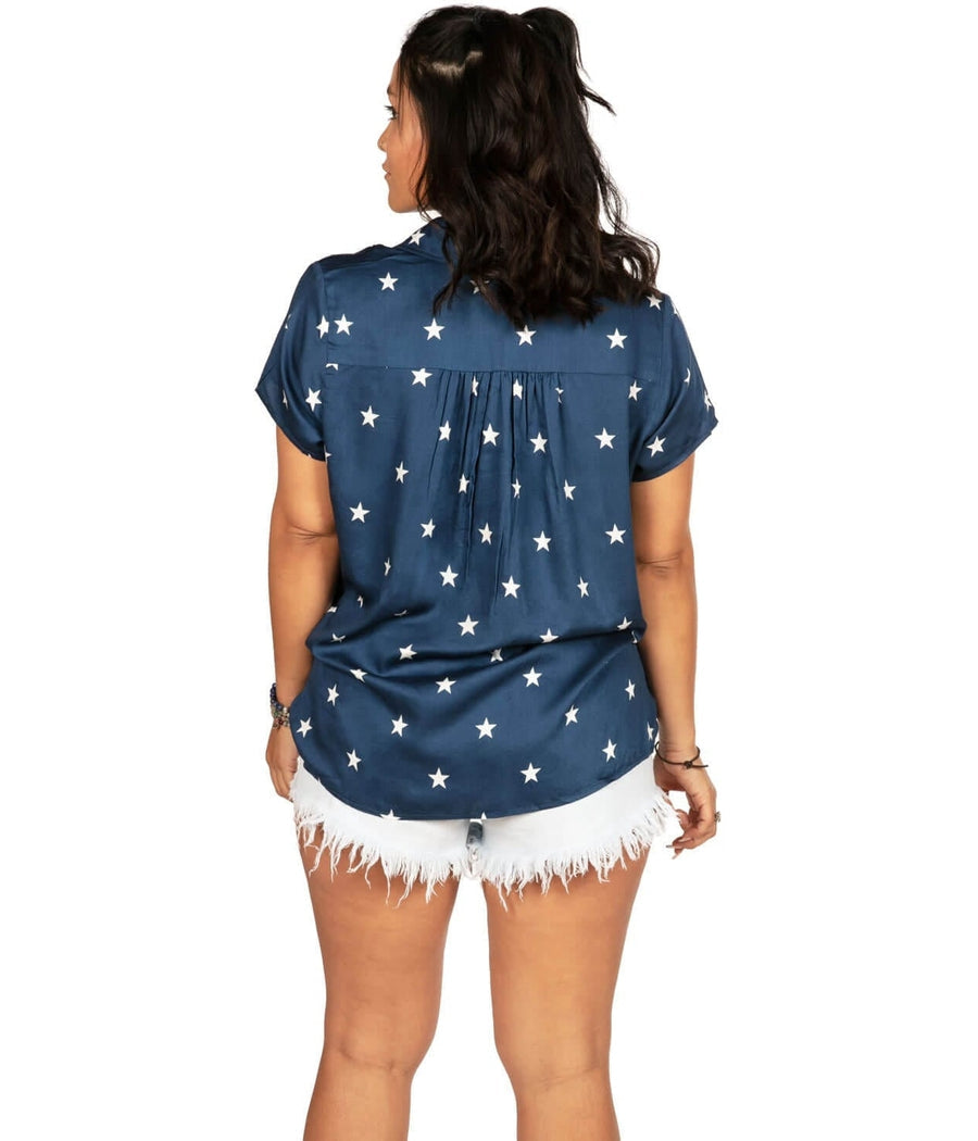 Transform your 4th of July celebrations with the Women's Classic Flag Button Down Shirt. This chic short sleeve shirt features an all-over American flag print that effortlessly elevates your festive attire, ensuring you stand out at any gathering.