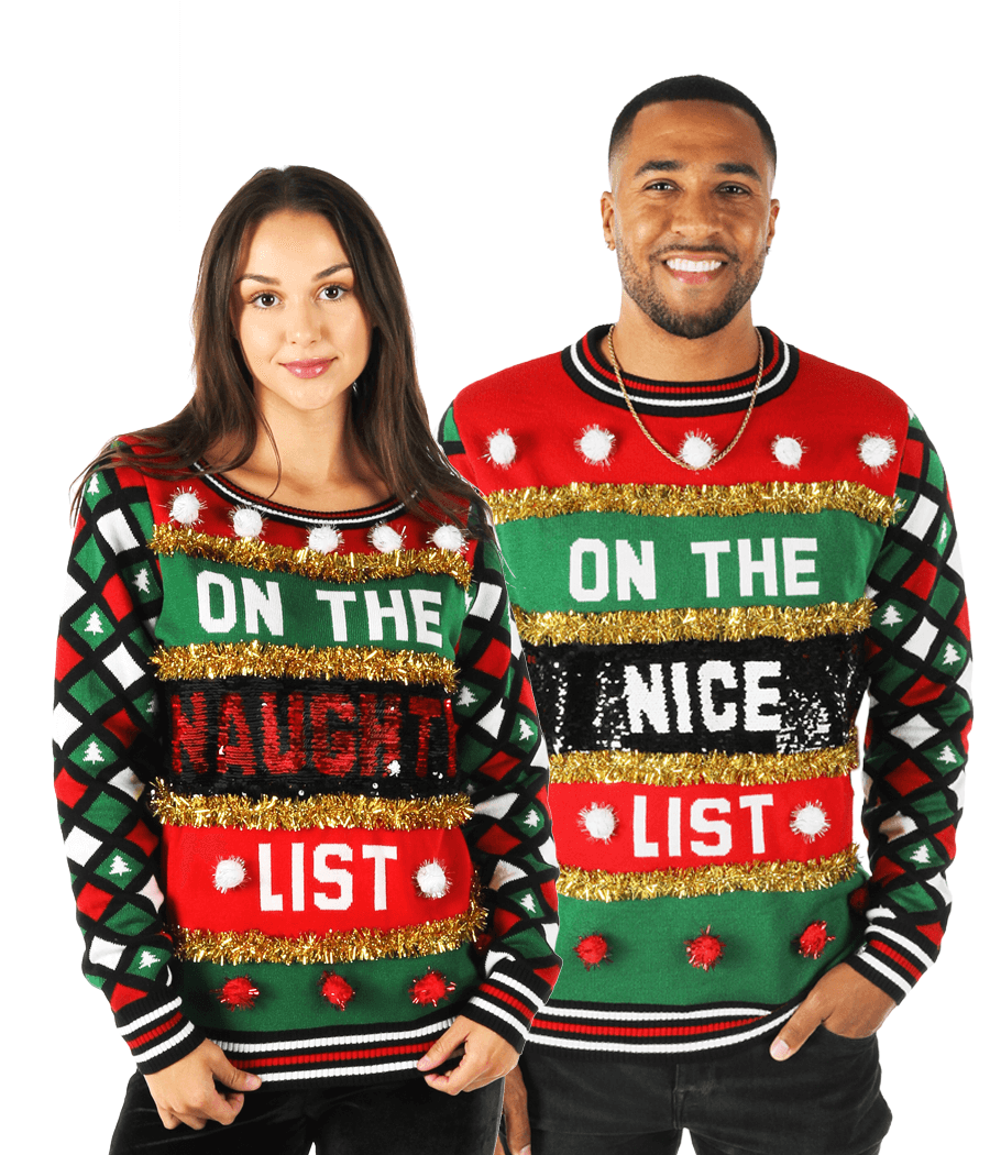 Show Your True Colors This Christmas Embrace the holiday spirit with our Matching Naughty or Nice Reversible Sequin Couples Ugly...