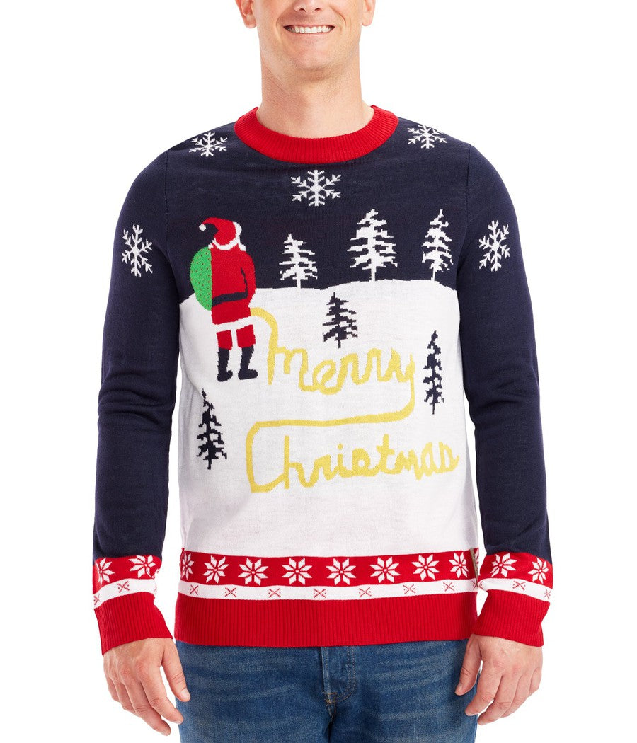 Get ready to turn heads and spark laughter with the Men's Yellow Snow Ugly Christmas Sweater. This playful piece features a humorous depiction of Santa in a hilariously relatable moment, bringing a lighthearted touch to your festive celebrations.